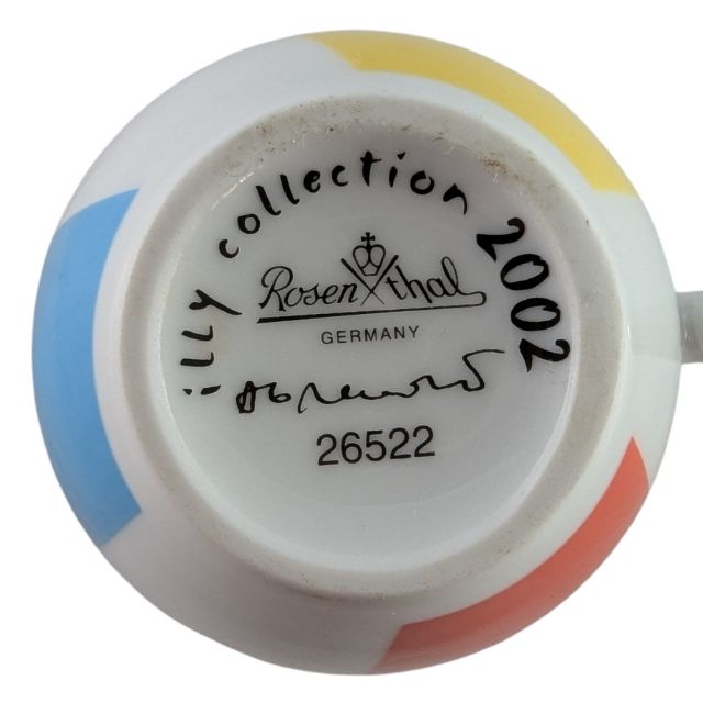 Marina Abramovic for Rosenthal - Illy Art Collection - an early 2000s German designer porcelain espresso set. The set comprises six cups and saucers, each with a beach ball design to the cups and beach scenes to the saucers. Each bearing makers' marks to the bases. Dated for 2002.