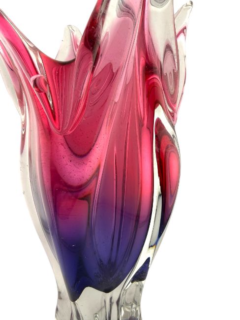 Josef Hospodka for Chribska - a vintage mid century circa 1960s Czech studio art glass vase. The vase having four flared floral arms over a shaped pinched body. In pink and purple colourways.