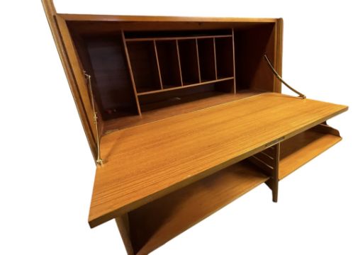 Robert Heal for Staples - Ladderax - a retro mid 20th century teak four-bay modular wall unit. The unit having a series of shelves, fall front cabinets / sliding door cabinets and drawers. All supported on teak uprights.