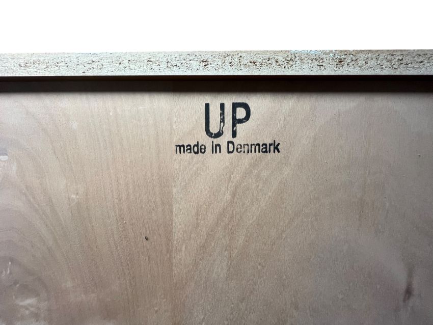 UP of Denmark - a pair of 20th century Danish teak-veneered bookcases. Each of slender upright form set with adjustable shelves. Each raised on a plinth base. Makers' mark to the verso.