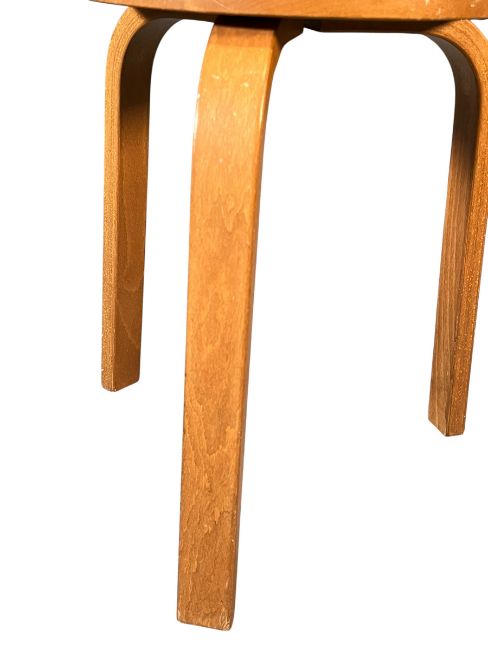 In the manner of Alvar Aalto - a retro 20th century laminated bentwood three legged stool. The seat having a circular top over three bentwood legs.