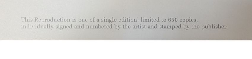 ARTISTS RE-SALE RIGHT. Buyers of the re-sold art of living artists will be charged the royalty where applicable. Currently this is 4% on any item sold at 1000 Euros or over, diminishing from 50,000 Euros. VAT is not applicable on this charge. Further details can be obtained from artistscollectingsociety.org.