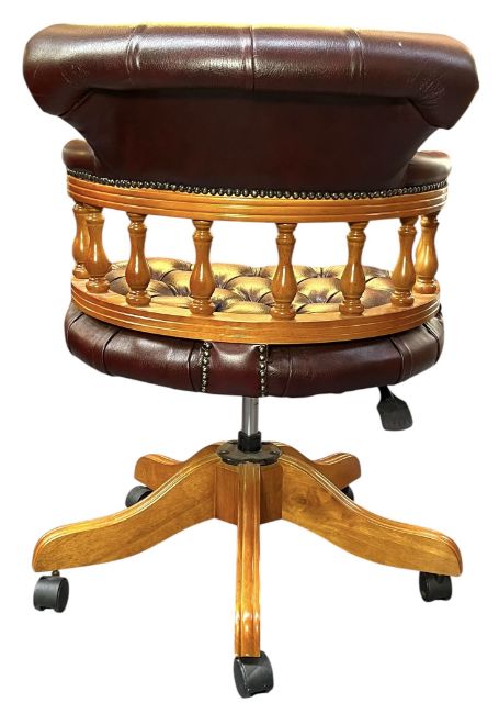A 20th century Chesterfield style oxblood captains swivel desk chair. The chair having a tufted leather top rail over a balustrade, over tufted buttoned seat. All raised on a swivel base upon castors.
