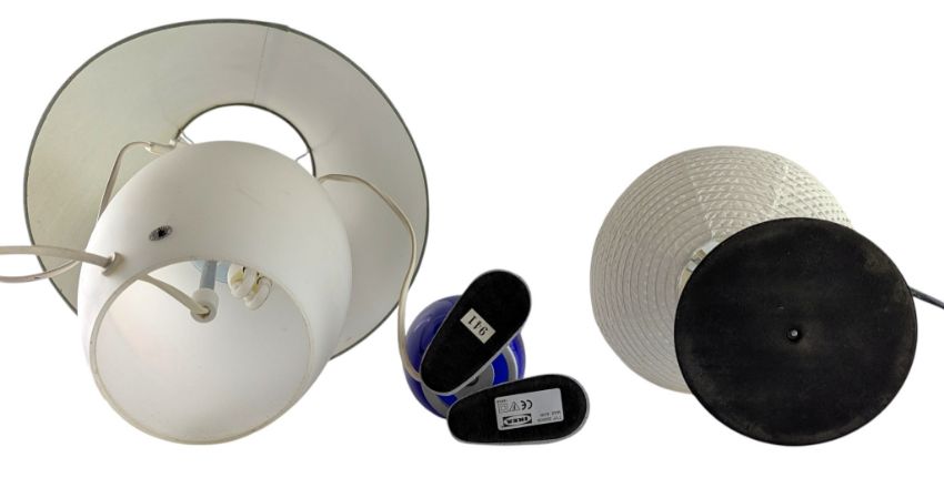 Vintage IKEA - an assortment of three 20th century circa 1990s glass and metal desk /table lamps. The lot to include an IKEA Rum desk lamp with paper shade and spring chrome body, a Fjorton Dino Egg blue glass and chrome desk lamp, type B9806, together with a type B9605 frosted glass body and conical shade table lamp. All sold as untested.