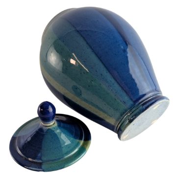 Julia Land (British 20th/21st Century) - a selection of studio art pottery tablewares. Each piece having blue glazed decorations with stylised accents. The lots includes teapot, lidded urn vase, jug and six mugs. Signed to the bases.