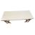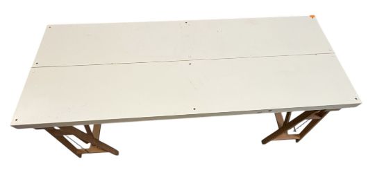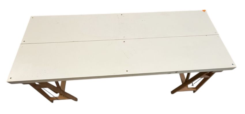 A modern white-topped trestle desk / work table. The table having a two-part white hardboard top raised on adjustable wooden trestle supports.
