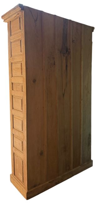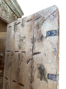 A large Indian teak two-door Almirah / cupboard. Flyaway cornice atop with heavily carved decoration over two full-length panelled doors with iron and stud banding. Bevelled edge panelled sides with all being raised on a plinth base.