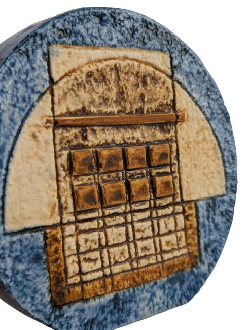 Avril Bennett for Troika Pottery - a retro 1970s Cornish studio art pottery wheel vase. The vase is finished in blue with geometric patterns. Signed to the base AB.