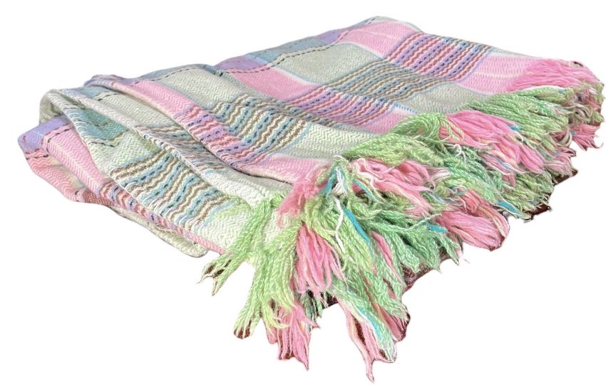 A vintage 20th century pure wool traditional Welsh blanket/bed throw. The blanket decorated in pink, green and light blue with a tartan pattern throughout. Tassels to ends.