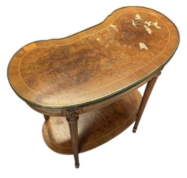 A French Louis XVI inspired 20th century burr walnut & ormolu kidney-shaped table. The kidney-shaped top with inlaid band and ormolu mounting, over a single drawer below. Single tier below with all raised on tapering supports.