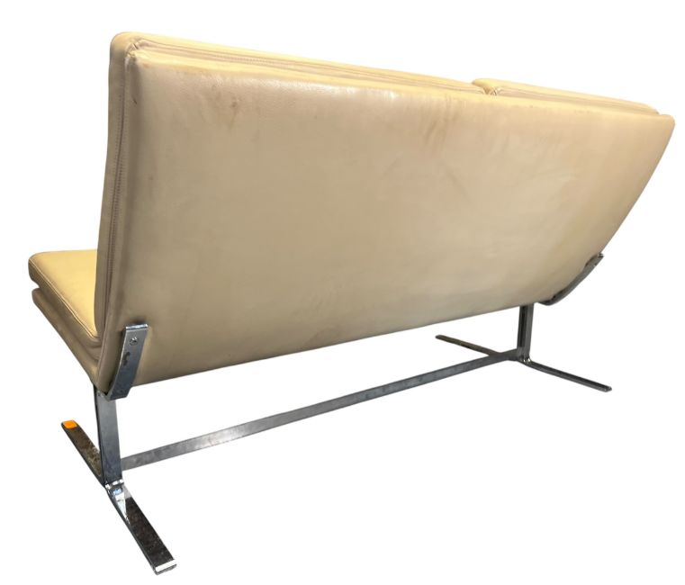 Poul Norreklit (1913-2007) for Selectform - a retro mid 20th century Danish designer two seater sofa. The sofa having cream leather upholstery with button detailing. All being raised on a polished steel frame.