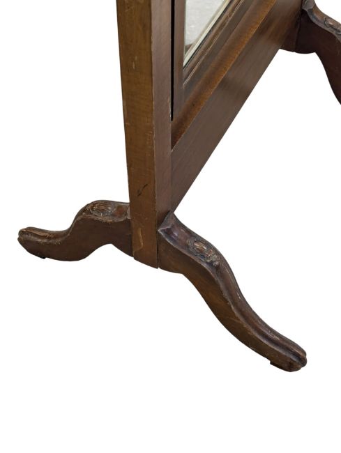 An early 20th century mahogany freestanding cheval mirror. The mirror having serpentine top over trestle supports. Measures approx: 158x49cm