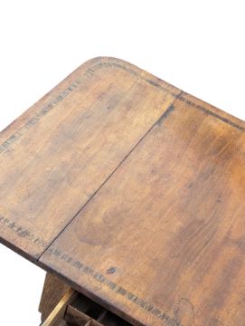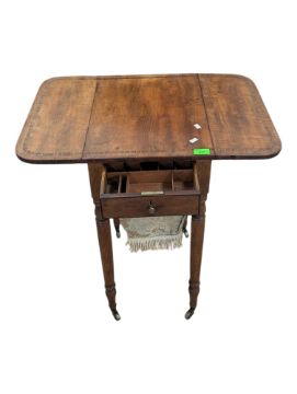 A Victorian 19th century ladies sewing work table. Oak construction rectangular form with drop leaf sides. With sewing material box to underside, raised on turned legs terminating in castors. Measures approx: 71x35x46cm 68cm extended