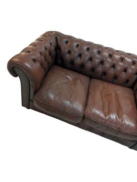 A 20th century Victorian Revival leather Chesterfield style two seater sofa. The sofa having tufted back and armrests over cushioned seats, upholstered in a tan brown leather. Measures approx: 70x152x90cm