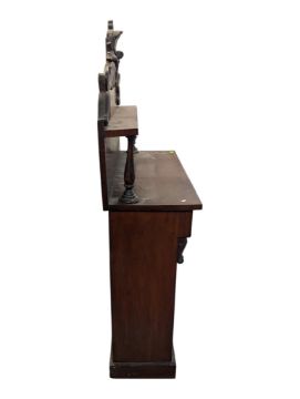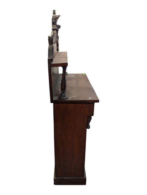 A 19th cenury Victorian mahogany chiffonier / sideboard. Having a carved and large gallery back with column supports. Atop a large base with twin cupboard doors with shelves within. All raised on a plinth base. Measures approx: 158x100x32cm