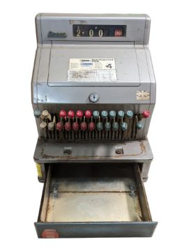 Gross Cash Registers Ltd, British - A mid century top cash register / shop till. In a grey metal colourway with hinged buttons and numerical display. With cash drawer to lower. Measures approx: 43x37x41cm