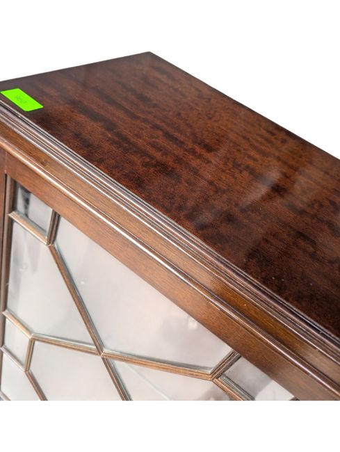 An early 20th century mahogany china display cabinet. Rectangular form with astragal glazed twin front doors with glass shelves within. Raised on carved cabriole legs with metal escutcheons. Measures approx: 127x110x34cm