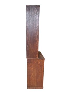 Early 20th century oak library bookcase. Rectangular form with twin glazed doors with shelves to interior. Apon a rectangular base with twin wooden doors with shelevs, turned pull handle raised on a plinth base. Manufactured by Wake & Dean Ltd, Yatton. Measures approx:214x93x48cm