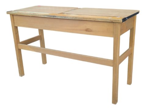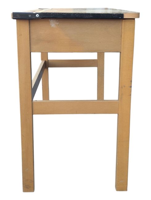 Vintage 20th century circa 1950s oak veneer school desk with two bentwood chairs. Desk of rectangular form with pen rests and lift up table tops all raised on four rectangular legs united by stretchers. The chairs being raised on A frame legs with single curved plank to back rest. Measures approx: 72x120x46cm