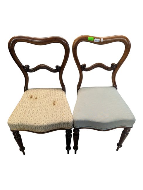 A set of 19th century Victorian mahogany balloon back / kidney back dining chairs. Raised on turned legs with overstuffed frames having ornate balloon shaped back rests to each. Measures approx: 87x44x50cm