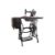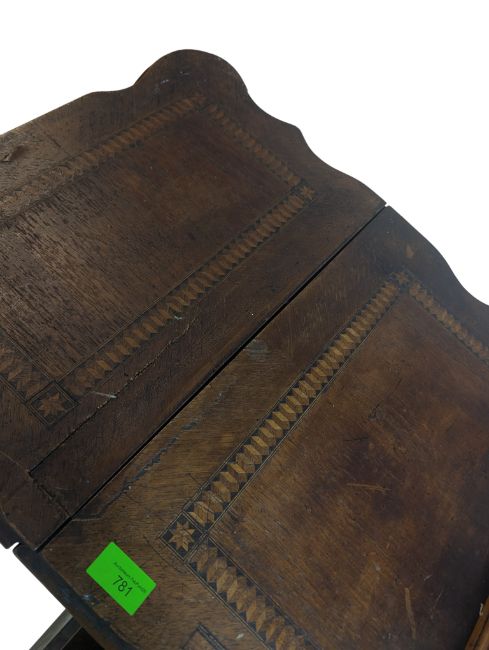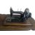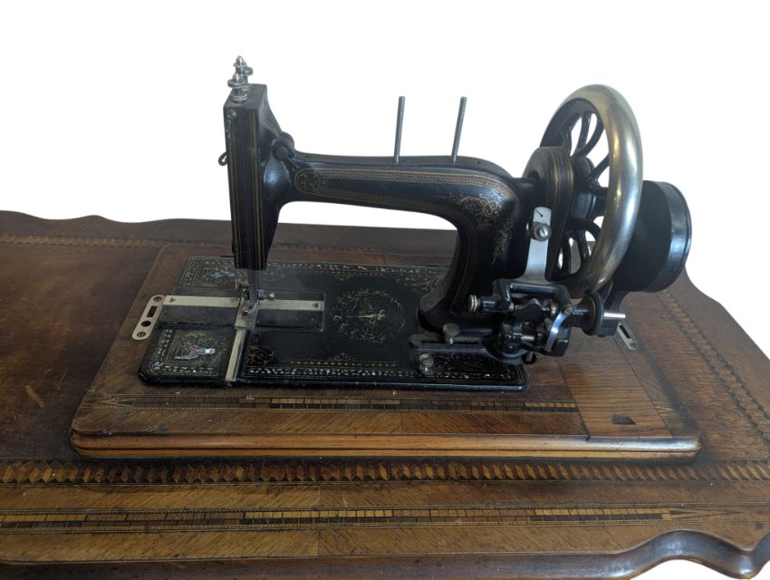 A Victorian 19th century treadle sewing table. Having the metal sewing machine with an ebonised body atop an oak shaped inlaid table. Singer branded ebonised metal frame with hinged foot pedal and trestle legs. Measures approx: 79x93x46cm