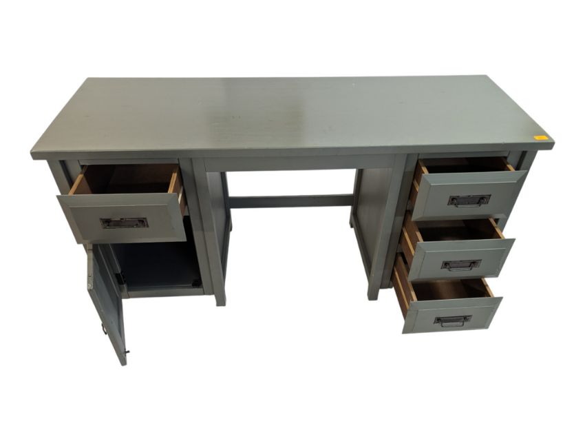 Modern Design - A painted grey twin pedestal office desk. Raised on squared supports with twin pedestals comprising a bank of drawers to the right, locker cupboard and single drawer to the left. Flared top above. Measures approx: 77x158x54cm