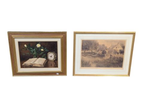A vintage 20th century oil on canvas still life study depicting a clock and a book signed Maioli Franco and a limited edition print by Keith Andrew entitled Summer Love. Framed. Measures approx: 49x59cm