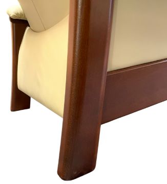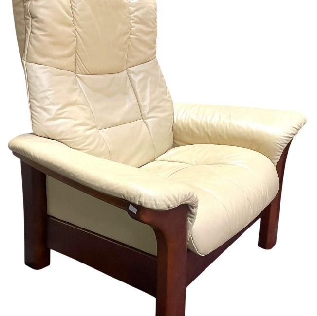 A pair of Contemporary Ekornes Stressless Windsor model teak-framed easy lounge armchairs. The chairs having a large white leather cushioned back rest and seat on straight supports.