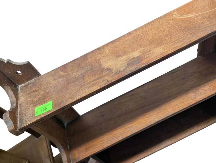 An early 20th century Chinoiserie whatnot etagere. The whatnot having faux bamboo frame with a series of two shelves. Together with an Edwardian circa 1900s era wall hanging cabinet having inset Mintons Aesops Fables blue and white ceramic tiles to each door. Measures approx: 61x61x16cm