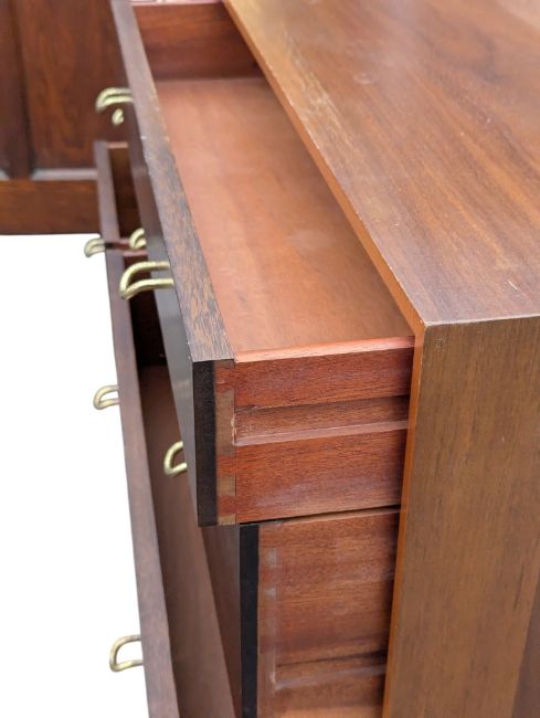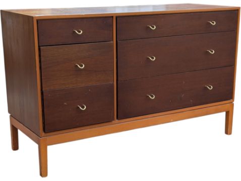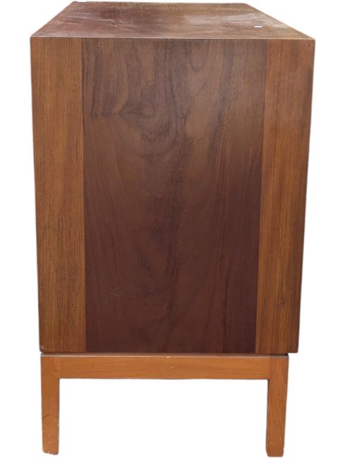 Mid century Times Furnishing chest of drawers containing a three narrow drawers to left and three wide drawers to right, U shaped brass pull handles. Measures approx: 70x113x44cm