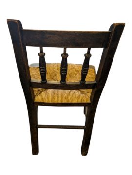 A pair of early 20th century Arts and Crafts style oak and rattan childrens chairs. The chairs having spindle backs over rattan seats on ring turned support and stretcher. Measures approx: 67x36x32cm