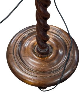 A 19th century mahogany barley twist standard floor standing lamp. Having an original lamp shade with tassels in red / gold colourway. Barely twist central column raised on a circular foot raised on ball feet.Measures approx: 178x52cm