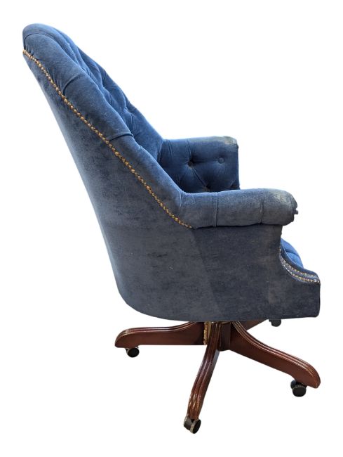 A 19th century Victorian revival button-backed office captains' style desk chair. The chair upholstered in a blue velvet with button-backed & brass stud detailing. All raised on a five-point swivel base on castors. Measures approx: 110x79x83cm