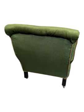 A Victorian 19th century green button back armchair. Padded back rest overstuff seat with cushioned elbow rests. Raised on turned feet ending in castors. Measures approx: 90x82x90cm
