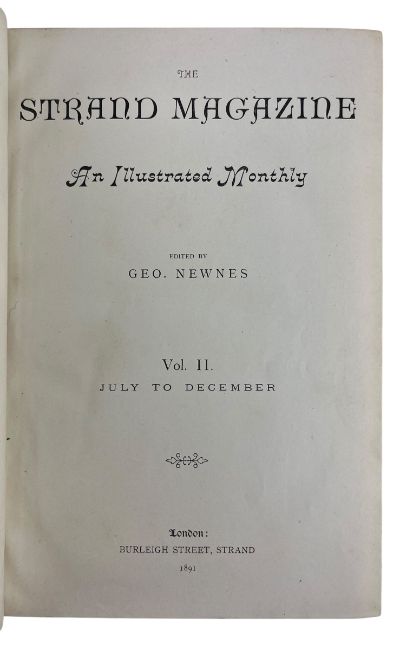 Newnes, George. 1891-4 Volumes I to VII of The Strand Magazine. London: George Newnes Ltd. A run of six volumes of The Strand periodical, consisting of issues from July 1891 to June 1894. Including the first appearance of Arthur Conan-Doyle's Sherlock Holmes, leading to widespread popularity. Illustrated throughout. Bound in half calf with cloth to the boards. (6)
