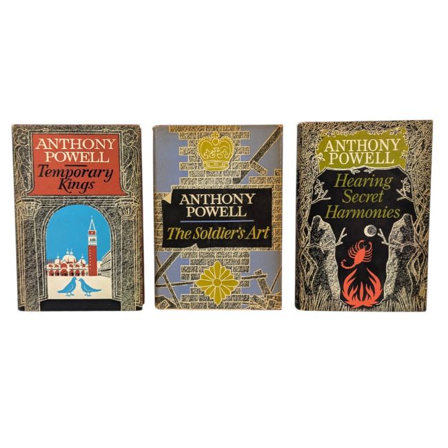 Powell, Anthony. Three bright first edition novels from Anthony Powell's celebrated "Dance to the Music of Time" series. To include The Soldier's Art (1966) Temporary Kings (1973) and Hearing Secret Harmonies (1975). London: Heinemann. Each volume is accompanied by the original, unclipped dust wrapper. (3)