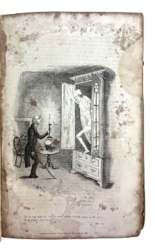 Dickens, Charles. 1837 The Posthumous Papers of the Pickwick Club. London: Chapman and Hall. First edition, early mixed issue. Extra-illustrated. Issue points include: Veller on the engraved vignette to the title page (it was 'Weller' in later issues); mark between 'r' and 'u' in 'rum' in the last line of page 10; 'E' to the foot of pages 25 and 27; second '3' in the pagination is present to page 303; 'Chapter XXVIII' to both pages 282 and 299; 'Picwkick' to the running title of page 375; page 261 correctly signed 'X2'; line 29 of page 260 corrected to 'holding'; line 5 of page 341 reads 'inscriptino'; line 21 to page 400 reading to 'this friends' (this was changed to 'his friends' in later issues); five lines of footnotes to page 9; plates have page numbers instead of captions. Issue points as given by John C. Eckel in The First Editions of the Writings of Charles Dickens. Without the suppressed Buss plates. Lacking the title page, retaining the engraved title page. With the bookplate of Canford Manor. Extra-illustrated copy, with sixty-four plates, including the frontispiece and engraved title page. Rather worn copy, with front board and backstrip detached. A good candidate for a rebind. (1)