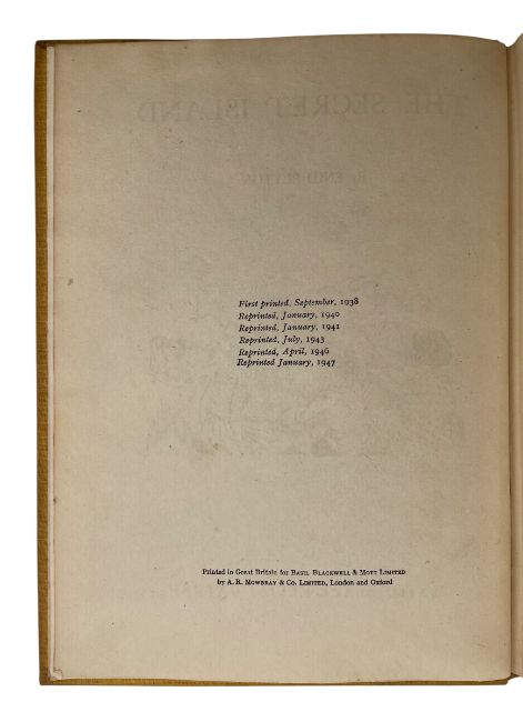 Blyton, Enid. 1947 The Secret Island. Signed by the author. Oxford: Basil Blackwell. Sixth impression, first published in 1938. Inscribed by the author "Jennifer Gilbert, love from Enid Blyton", to the front free endpaper. As mentioned in a letter from the author that was originally sent with this copy, Blyton gifted this book to an unwell child in 1950, although as she did not know the child's first name, she left a space blank for her mother, Mrs. Gilbert, to fill in. Charmingly illustrated throughout, including with a colour frontispiece. (1)