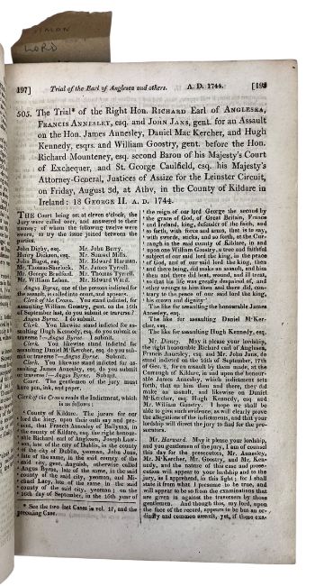 1809-1828 Cobbett's Complete Collection of State Trials and Proceedings for High Treason and Other Crimes and Misdemeanors from the Earliest Period to the Present Time. London: Printed by T. C. Hansard. Published by R. Bagshaw. In thirty-three volumes, including the index volume. Lacking volume XII.