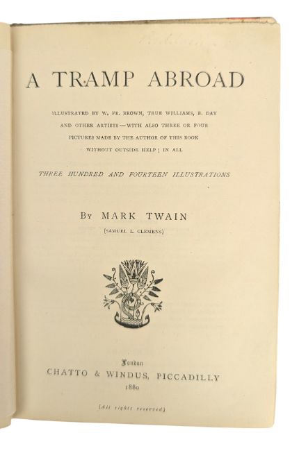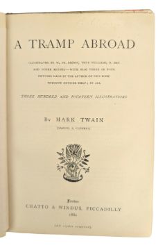 Twain, Mark. 1880 A Tramp Abroad. London: Chatto & Windus. First edition. Bound in the publisher's pictorial cloth. Illustrated throughout by artists including W. Fr. Brown, True Williams, B. Day, and others. A smart first edition copy of Twain's popular travel account. Together with Beautiful Joe (1894) by Marshall Saunders, A Kentucky Cardinal and Aftermath (1901) by James Lane Allen, and The Robber (1903) by G. P. R. James. (4)