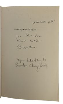 A collection of signed modern poetry books. To include Standing Female Nude (1985) by Carol Ann Duffy, Plumbing in Harlem (2003) by Joe Benevento, Love Chronicle from an Eastern Land (2003) by R. P. Flindall, Poems of Boyhood and Youth (1990) by Arthur Lazzam, Poetry from Scratch (1999) by Nathan Lemel, A Little in Love (2014) by Susan Fletcher, Shining Moments (1993) by Neal Henry Lawrence, and Grandma's Tales ( 1995) by Helena Campos Henriques. Standing Female Nude contains a handwritten inscription from Duffy to fellow poet, Brendan Cleary. All volumes signed. Each in the publisher's original binding, comprised of cloth-bound, paperback, and hardback volumes. (8)
