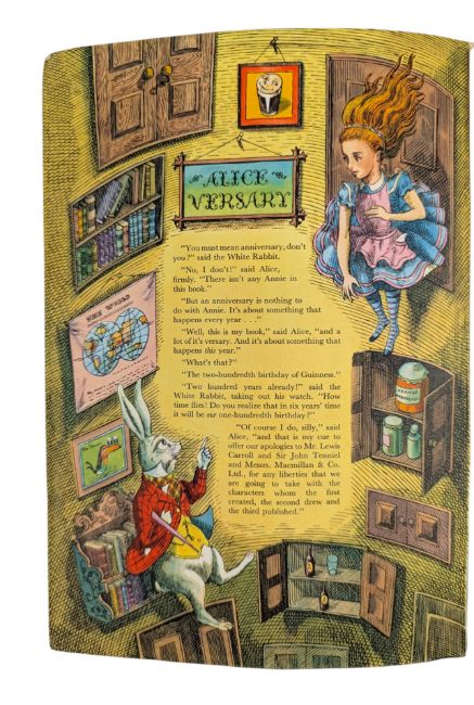 Breweriana - Guinness, Alice in Wonderland. A collection of vintage advertising booklets from Guinness, all relating to the works of Lewis Carroll, in particular, Alice in Wonderland. By S. H. Benson. The lot comprising Aliceversary - The Guinness Birthday Book (1959); Alice Where Art Thou? More Guinness Carrolling; Alice Aforethought (1938); Jabberwocky Re-Versed and other Guinness Versions (1935); The Guinness Alice (1933), with a compliments slip from Arthur Guinness, Son & Co. loosely inserted. Colourfully illustrated throughout. Printed by John Waddington. Given to the vendor's relative, who worked for the brewery in the 1930s. All bound in the publisher's original decorative wraps. 8vo. (5)