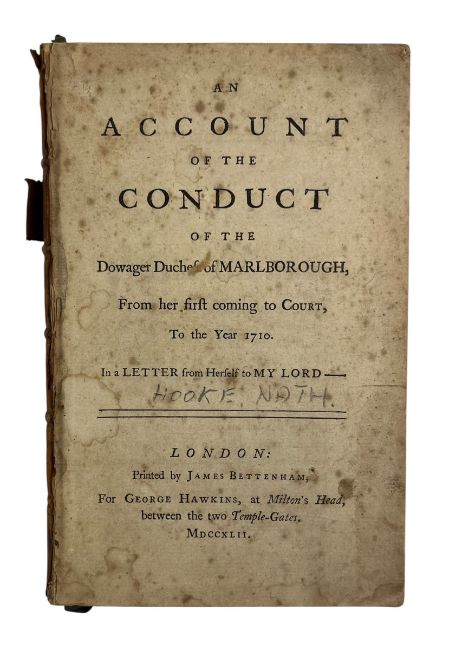 [Hooke, Nathaniel] 1742 An Account of the Conduct of the Dowager Duchess of Marlborough, From her first coming to Court, To the Year 1710. In a Letter from Herself to My Lord. London: Printed by James Bettenham for George Hawkins. The account of Sarah Churchill, dictated to her friend Nathaniel Hooke, who edited the work. Sarah Churchill and her husband's justification of their service to Queen Anne, defending their reputation and influence. 319pp. (1)