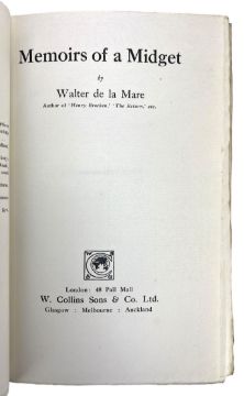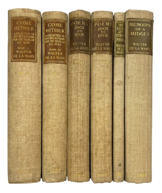 De La Mare, Walter. A collection of signed, limited edition poetry books and novels by Walter de la Mare. London: Constable and Company & W. Collins and Sons. To include Poems 1901 to 1918 (1920) in two volumes, The Veil and Other Poems (1921), Memoirs of a Midget (1921), and Come Hither (1923) in two volumes. Each volume is signed to the colophon, apart from the second volume of Come Hither. A wonderful collection of limited edition copies, bound in the publisher's quarter cloth. (6)
