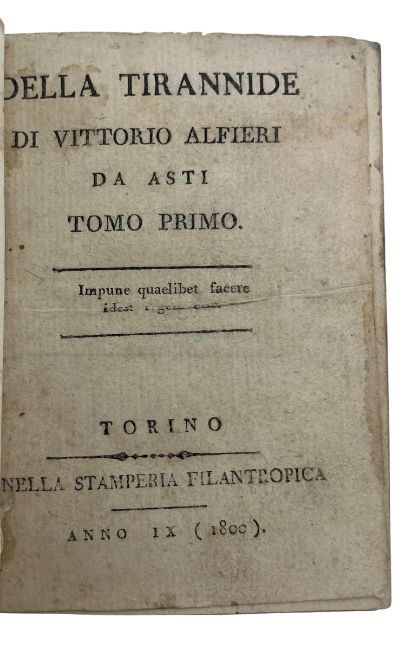 Alfieri, Vittorio. 1800 Della Tirannide. Torino: Nella Stamperia Filantropica. Two volumes bound in one. A scarce, 1800 edition of Vittorio Alfieri's passionate essay in which he argues that tyranny is defined as any government or ruler who acts as though they are above the law. Controversially, Alfieri suggested that many European countries of the time fell under this definition of tyranny. Bound in quarter calf. With the bookplate of Margaret Dyson. (1)