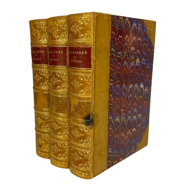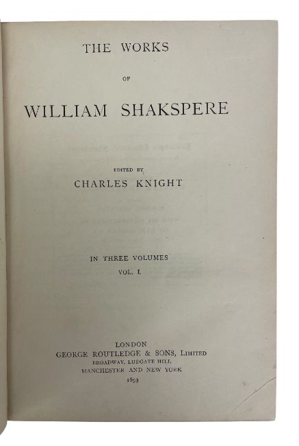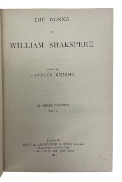 Knight, Charles [Ed.]. 1893 The Works of William Shakspere. In three volumes. London: George Routledge & Sons. Bound in half calf with marbled paper-covered boards. Charles Knight's comprehensive collection of Shakespeare's plays and poetry, including Macbeth, Hamlet, The Tempest, and many others. (3)