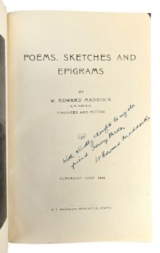 A collection of signed poetry books from the 20th century, some of which are limited editions. To include To Build a Bridge (1965) by A. E. Dodd, Motley Heraldry by The Fool of Arms edited by C. W. Scott-Giles, The Stars, The World, and The Women (1930) by Rhys Davies, The Little Centaur (1935) by Peri Cotgrave, and Poems, Sketches and Epigrams (1944) by W. Edward Maddock. All volumes signed. Bound in full cloth, with slipcase to Motley Heraldry. (5)