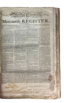 Bristol interest. An impressive collection of articles from 18th and 19th-century Bristol-based newspapers, bound over two volumes. Comprised of issues of Felix Farley's Bristol Journal, the Bristol Chronicle and Mercantile Register, The Bristol Journal (prior to Felix Farley's involvement), and The Bristol Gazettee. One volume contains articles from the years 1761-1776 from a variety of publications, while the other volume contains solely Saturday issues from Felix Farley's Bristol Journal, taken from 1822-24. Filled with topical information regarding 18th-19th century events, such as the military efforts of British and foreign nations during the Seven Years War, as well as Bristol-based shipping news. With many pages of local advertisements, including those for business premises, items for auction, houses for sale, etc. Pages are dotted with the occasional stamp of Semper Eadem Halfpenny, symbolising Queen Anne's halfpenny taxation applied to British newspapers in the 17th-18th century. Two large volumes. (2)