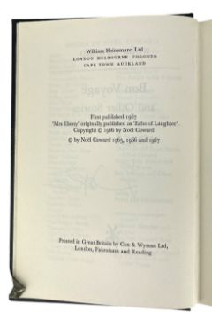Coward, Noel. 1967 Bon Voyage and Other Stories. London: Heinemann. First edition, signed by the author to the title page. An excellent copy of this collection of four stories from Noel Coward. Signed by the author to his friend, Jane Armitage, possibly a relation of Coward's actor friend Graham Armitage. Bound in the publisher's cloth, with the original unclipped dust wrapper. (1)