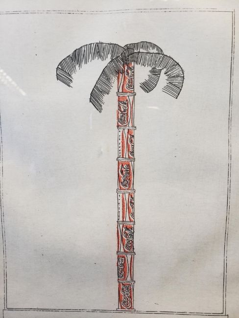 1974 Coca Cola limited edition etching print of three cokes a day print no. 2 out of 75. Depicting a palm tree made out of Coca Cola cans and titled '3 cokes a day keeps the sun from your bum, hippy, hippy, horrah'. Signed, dated and titled in pencil by the artist. Signture illegible. Glazed and mounted, measuring approx. 50cm x 40cm.